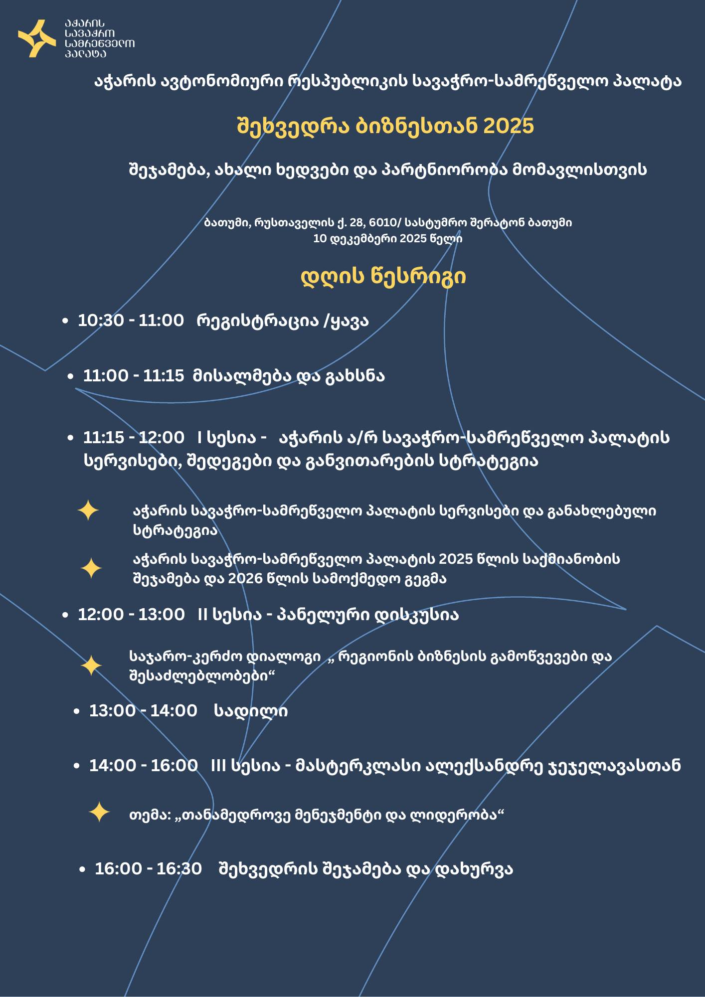 აჭარის ა.რ. სავაჭრო-სამრეწველო პალატის მისიაა ადგილობრივი ბიზნესების მხარდაჭერით ხელი შევუწყოთ აჭარის რეგიონის ეკონომიკურ ზრდას და განვითარებას. 2006 წლიდან დღემდე, სავაჭრო პატალაში 400-მდე წევრი გავაერთიანეთ და მჭიდრო თანამშრომლობა დავამყარეთ საერთაშორისო პარტნიორებთან, რითიც რეგიონში გავხდით ბიზნესისთვის უალტერნატივო პარტნიორი.